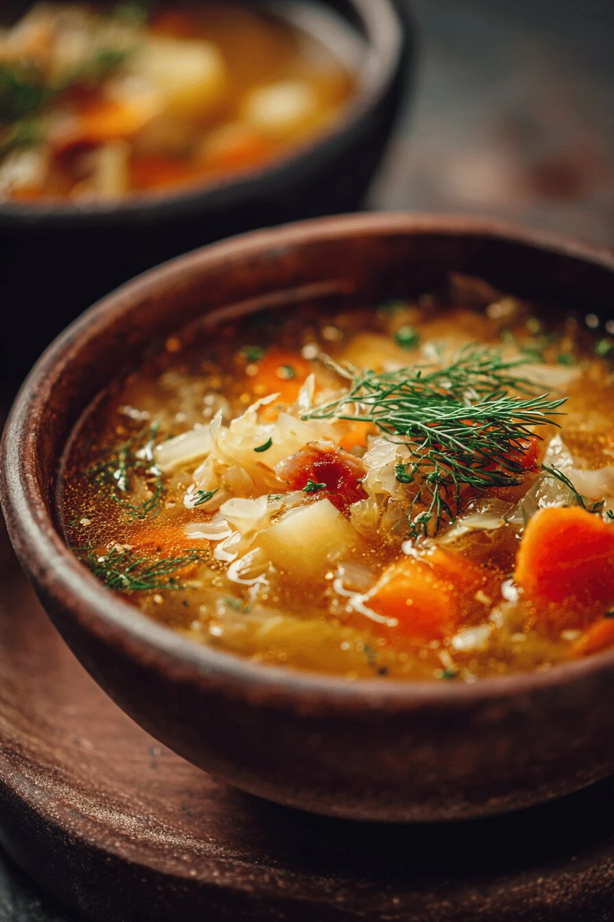 The cabbage will disintegrate slightly. This isn’t a mistake. It’s what you want. The broth gets cloudy and thick. The vegetables are almost melted into the liquid.