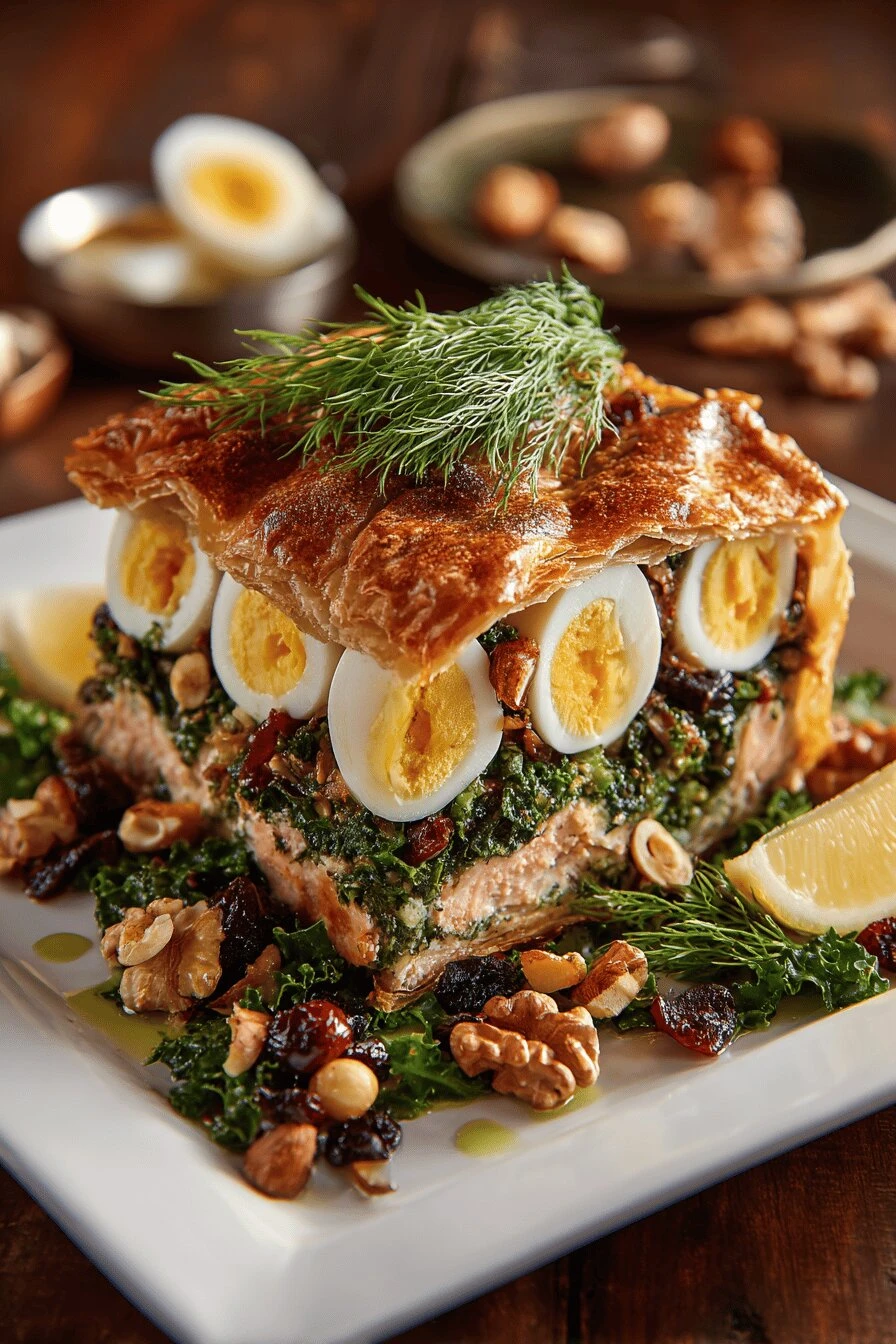 Salmon filet, half-cooked. Kale pressed dry. Hard-boiled eggs lined up like soldiers. Wrapped in spelt dough. Baked until the whole thing cracks when you tap it. This is koulibiac, but different—hazelnuts instead of pine nuts, tart cherries that snap against the fatty salmon. Takes an hour forty total. Prep takes fifty-five minutes of actual work, baking another forty-five. Sounds complicated. Isn’t.