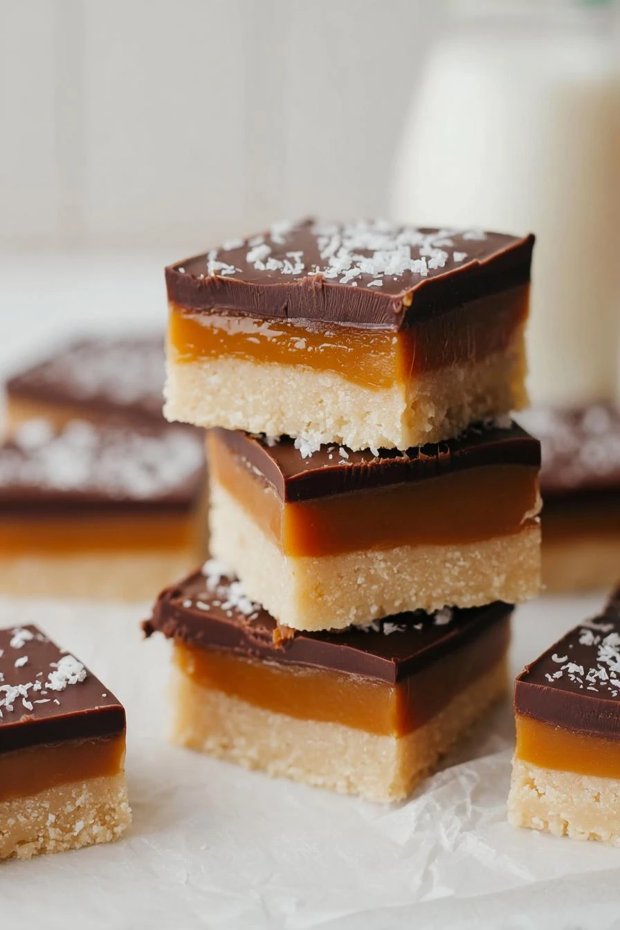Pull from oven, crust still warm, that buttery smell filling the kitchen—this is when you know the shortbread worked. Three layers, one pan, five hours start to finish including chill time but most of that’s just patience. Salted caramel chocolate bars that crack the way they’re supposed to, where the flaky sea salt actually matters and doesn’t just sit on top looking pretty.