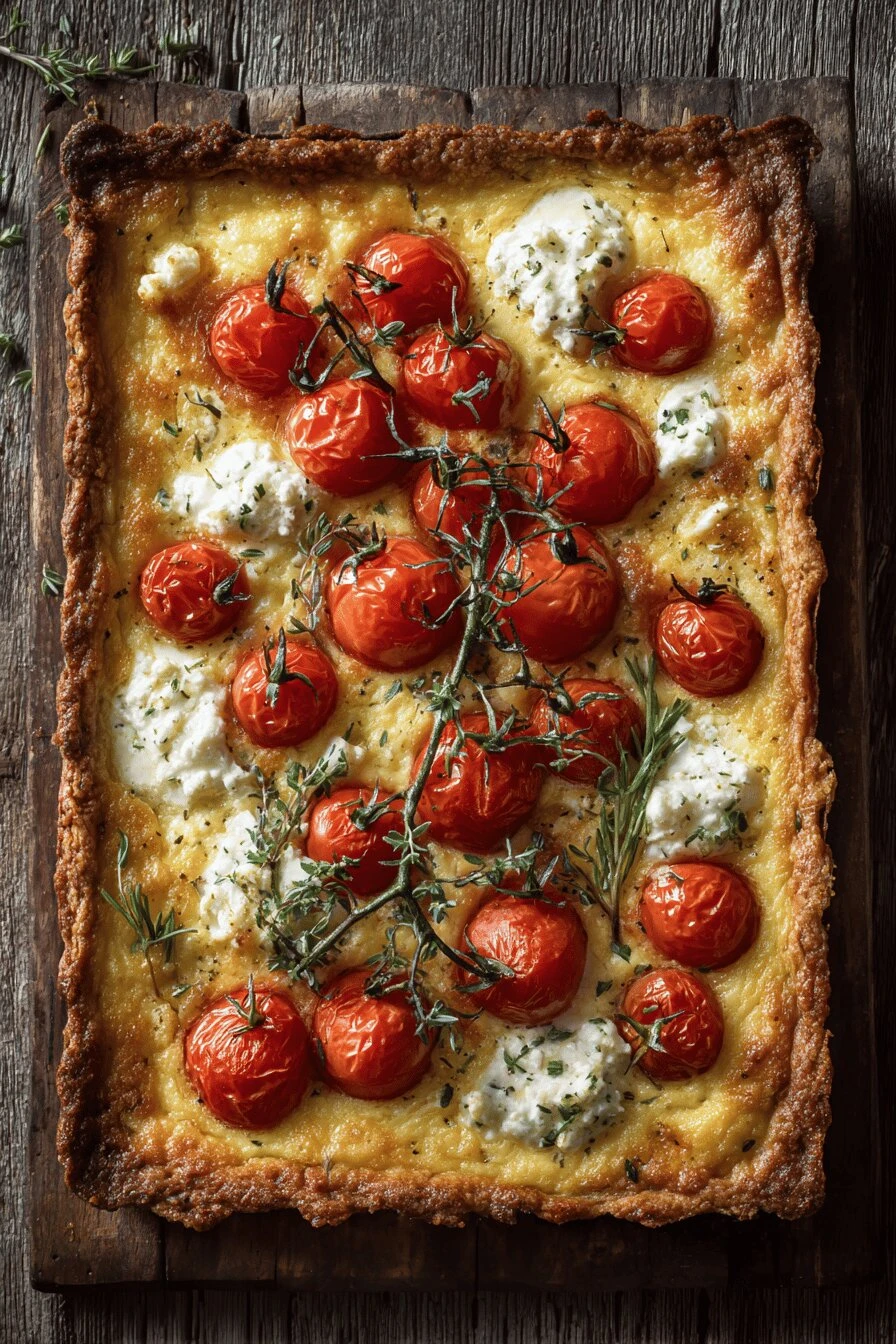 Cherry tomatoes still on the vine, roasted until they collapse into the custard underneath. That’s the whole thing. Dough made with almond flour so it’s already kind of done before it goes in the oven. 33 minutes of prep, 30 minutes of baking, and you’re eating something that tastes like you took an actual class somewhere.