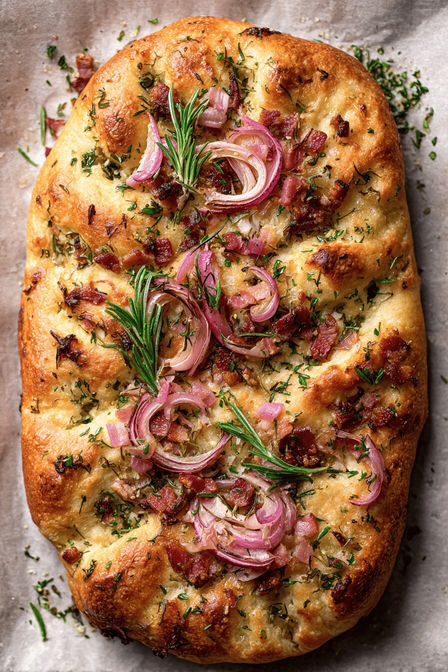 This is herb fougasse — a French bread that looks way harder than it actually is. Red onion and pancetta go into the dough. Fresh thyme. Garlic. The thing bakes up with a crust that cracks when you bite it and an inside that’s chewy and open. Homemade bread that tastes like you’ve been baking for years.