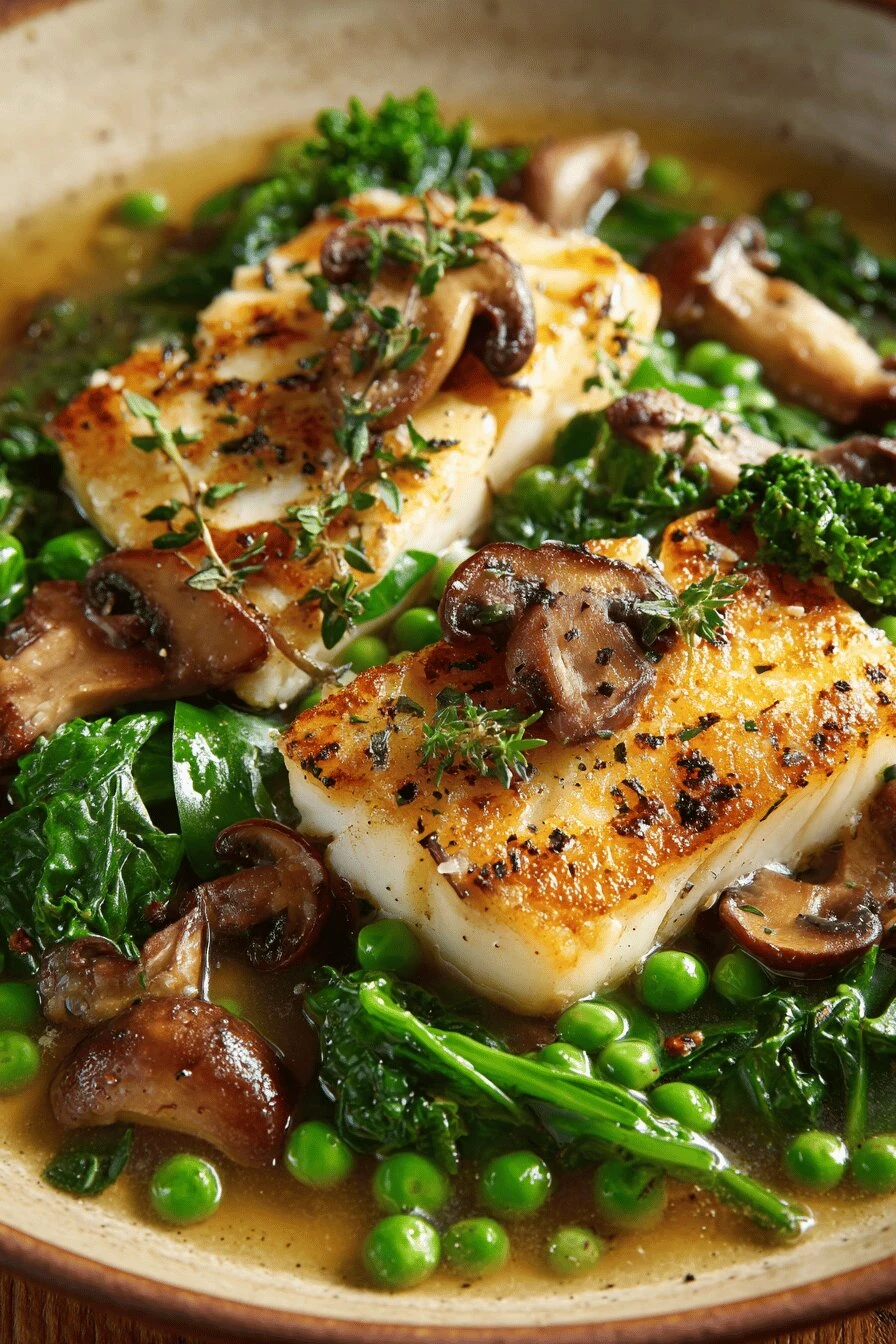 Takes 42 minutes start to finish. Actual cooking is maybe 17 minutes. One skillet, mostly. Minimal cleanup. Tastes like you planned this for days but honestly took 25 minutes prep. Works on a weeknight when you need something fast that doesn’t taste rushed. Healthy without feeling like you’re eating something healthy. Just good fish, mushrooms that taste like mushrooms, greens that aren’t bitter for once.