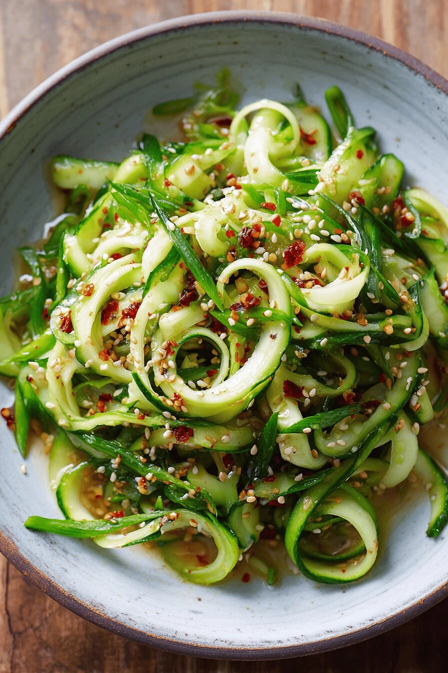Spiralize the cucumbers first — or peel them into strips if you don’t have one. Either way, thin ribbons. That’s the whole thing. Rice vinegar, sesame oil, honey, lime juice. Mix it. Toss. Done in 22 minutes flat.