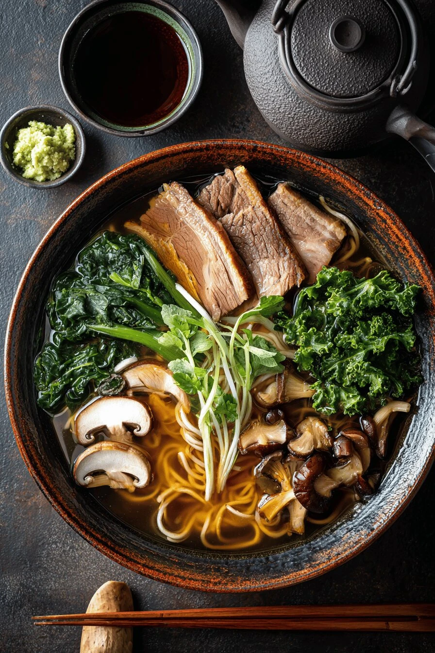 One litre vegetable stock. Reduced-sodium. Regular stuff works. White miso paste—two tablespoons. Red miso works too if that’s what’s in your fridge. Slightly different taste, saltier, adjust accordingly. Soy sauce. A tablespoon. Ginger. A knob about the size of your thumb. Smash it flat with the side of your knife. Bruising it matters more than slicing. Kombu seaweed. One strip, maybe five centimetres long. If you can’t find it, wakame flakes work but add them near the end or they get slimy. Four medium carrots, peeled, cut into four-centimetre sticks. They’re in there to absorb the broth flavor while it steeps. Pork shoulder, sliced thin. 450 grams. Ask the butcher. Seriously. Say “hot pot thin” and they’ll slice it right. Don’t try a knife—it falls apart. Soba noodles. Cooked, drained, tossed in a little toasted sesame oil so they don’t stick together. 225 grams. Oyster mushrooms. Cleaned, halved. 225 grams. Enoki or shiitake if oyster’s gone. Baby kale. 25 grams. Handful. Nothing fancy. Scallions. Two of them, cut into four-centimetre lengths. Ponzu sauce for dipping. Wasabi if you want heat.