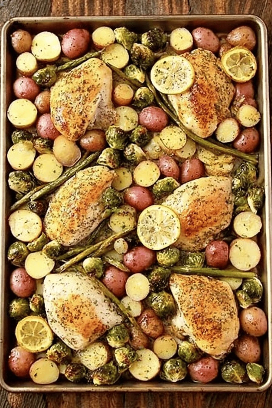 Don’t crowd the pan. This is where people mess up. They pile everything because one pan seems economical. It steams instead of roasts. Spread it out. The sauce goes on cooked chicken, not raw. Wait until the chicken’s actually in the oven before you add the final glaze. Well, you do add it before the oven—but don’t marinate it. Just coat it right before it goes in. Pull it out and splash the remaining lemon juice over the entire pan while it’s hot. The acid hits the warm food and the scent just opens up. Finishes the brightness of the whole thing. Let it sit maybe three minutes. Not to cool it down—to let the juices redistribute through the chicken. It’ll still be hot. Everything settles a bit. Serve straight off the pan. That’s the whole point. Rustic. No plating. No fuss.