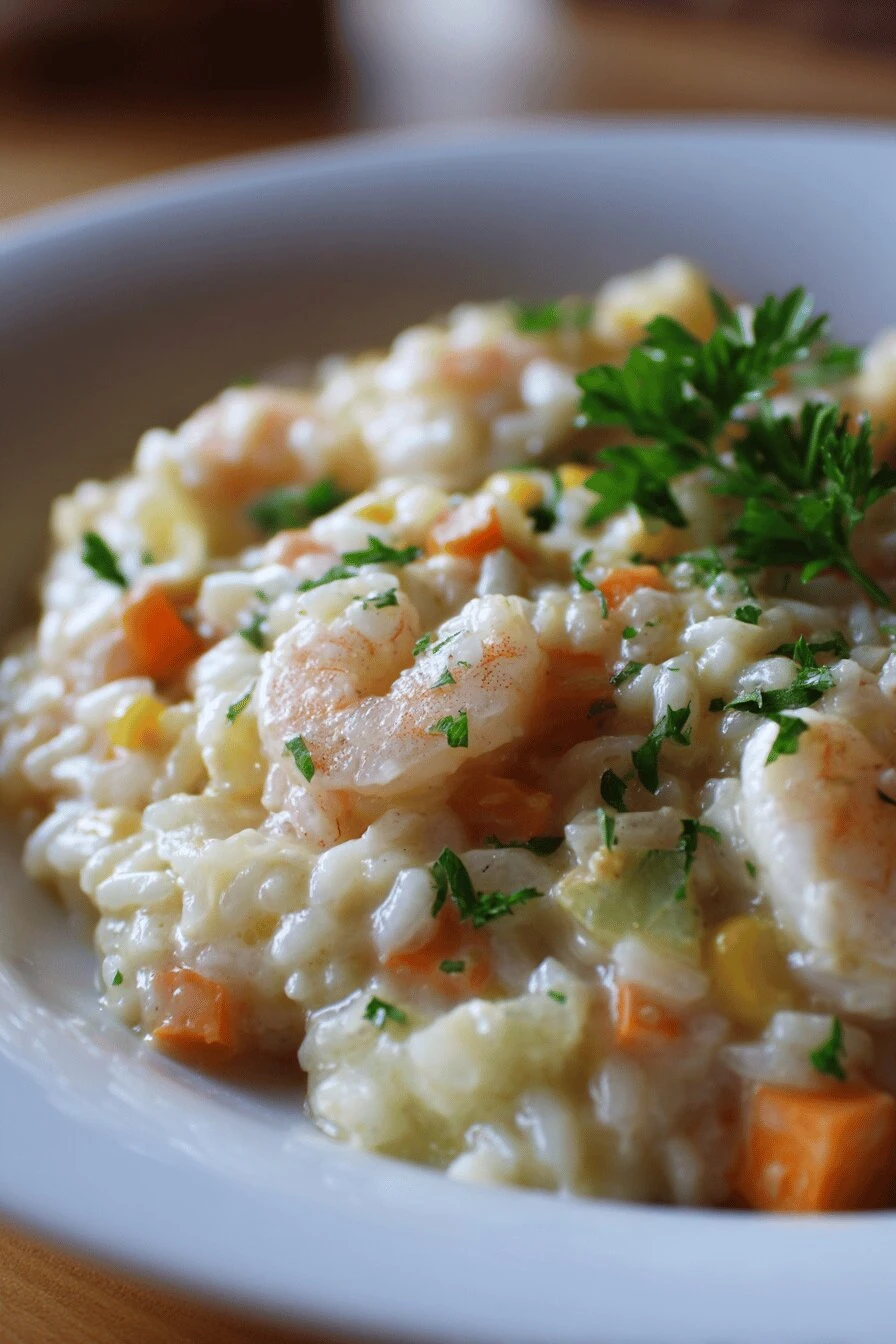 Chicken broth. Low sodium. Save the salt for the end when you can taste it and fix it. Whole milk. Not half-and-half. Not cream. Cream makes it too rich and butter-colored. Milk keeps it light. Arborio rice—that’s the one with the fat grains that release starch. Regular rice just becomes mush. Don’t bother switching it. Shrimp, peeled and deveined. About three-quarters of a pound. Chop them into chunks. Whole shrimp get lost in the risotto. Fresh parsley at the end. Dried tastes like dust in this one. Carrot, celery, onion—the base. Mince them small. They cook down fast and disappear into the rice, which is the point. Olive oil. Good oil. Three tablespoons. Dry white wine. A quarter cup. Not cooking wine. Actual wine you’d drink. Corn. Frozen works. Thawed and drained. Fresh if you have it. A cup either way. Salt, pepper, nutmeg. The nutmeg is a pinch—like, actually a pinch. Too much and it takes over.