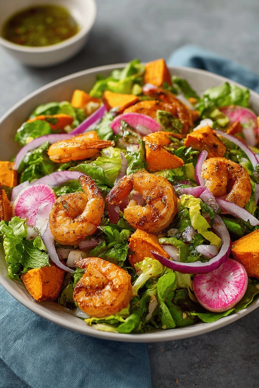 Four hundred grams of shrimp. Tails off. Makes a difference in how they feel when you eat them. Two medium sweet potatoes cut into two-centimeter cubes—not smaller or they get mushy, not bigger and the edges burn before the middle softens. One small red onion, sliced thin. Two radishes. The peppery thing matters. Two cups of mixed greens, whatever you have. Olive oil, not vegetable oil—the smoke point’s fine and it tastes better. Smoked paprika and ground cumin. Two cloves of garlic, minced. One lemon—zest it first, then juice it. Fresh parsley if you can grab it. Salt and pepper.