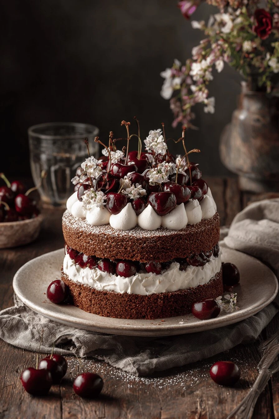 Fifty minutes of actual work, then fifty more in the oven. Black forest cake sounds complicated — chocolate, cherries, espresso, chantilly cream stacked in layers. It’s not. Just methodical. Each part separate. Then stack.