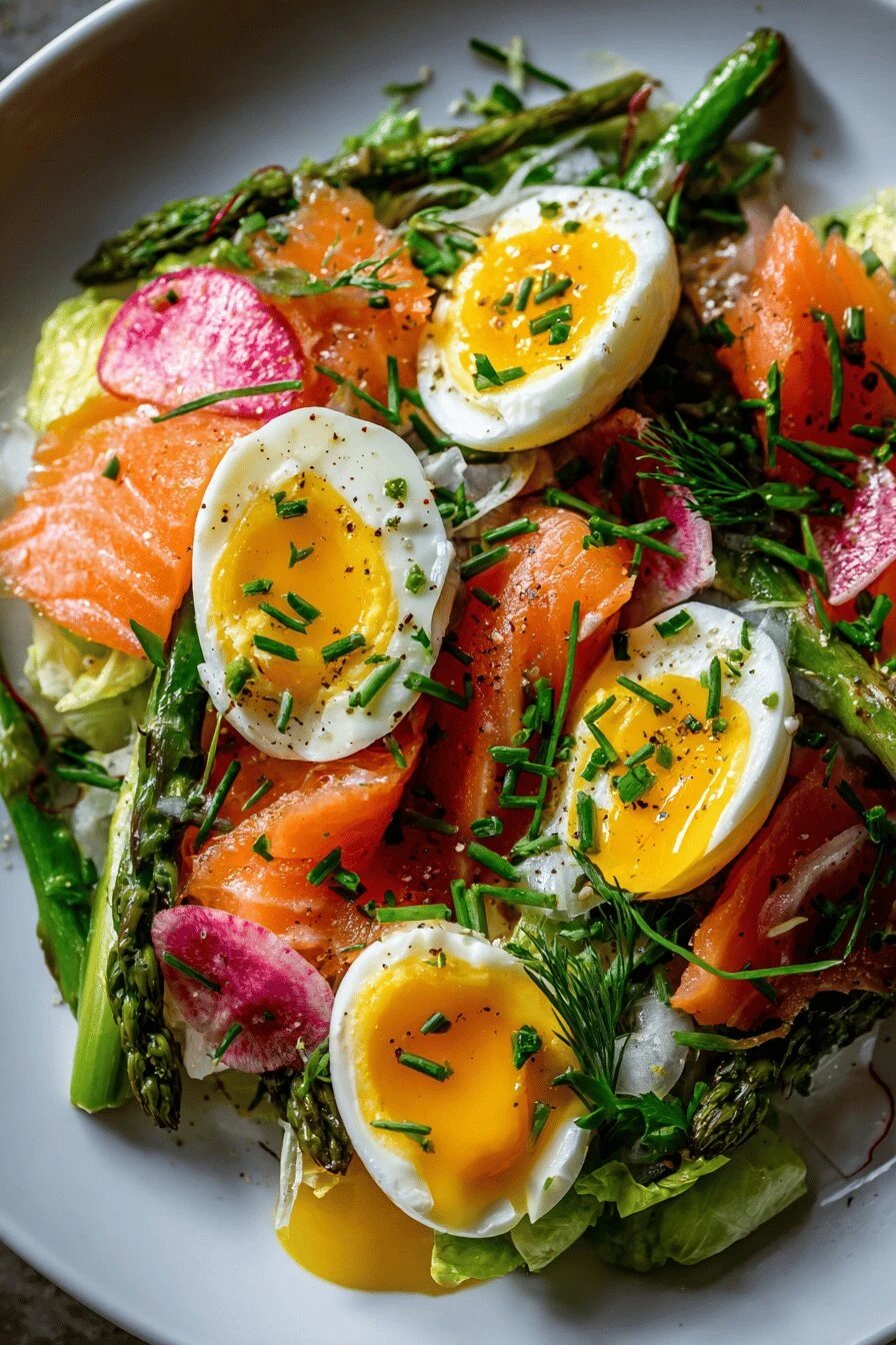 Protein that doesn’t feel heavy. Eggs and smoked fish and nothing else preachy about it. The asparagus stays crisp. Not mushy. Not raw. That weird middle ground where it’s actually good. Works cold for lunch the next day—maybe better cold, honestly. One dressing does everything. Lemon yogurt with dill. That’s the whole sauce situation. Covers the eggs, the greens, the fish. Done. Looks like you know what you’re doing. Mimosa eggs on top. Radishes sliced thin. Shallots. It photographs itself.