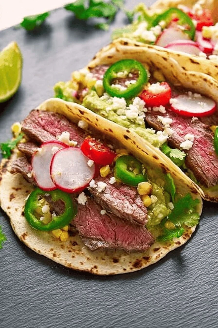 - 4 Assemble tacos. Thin smear of the avocado cilantro sauce on each tortilla first; acts as moisture barrier and flavor base. Top with sliced steak across grain thinly for tenderness, then scatter charred corn kernels for sweetness, sprinkles of queso fresco for salt and crumbly texture, sliced jalapeños for crunch and heat, and finish with fresh pico de gallo to cut richness and add acidity.
