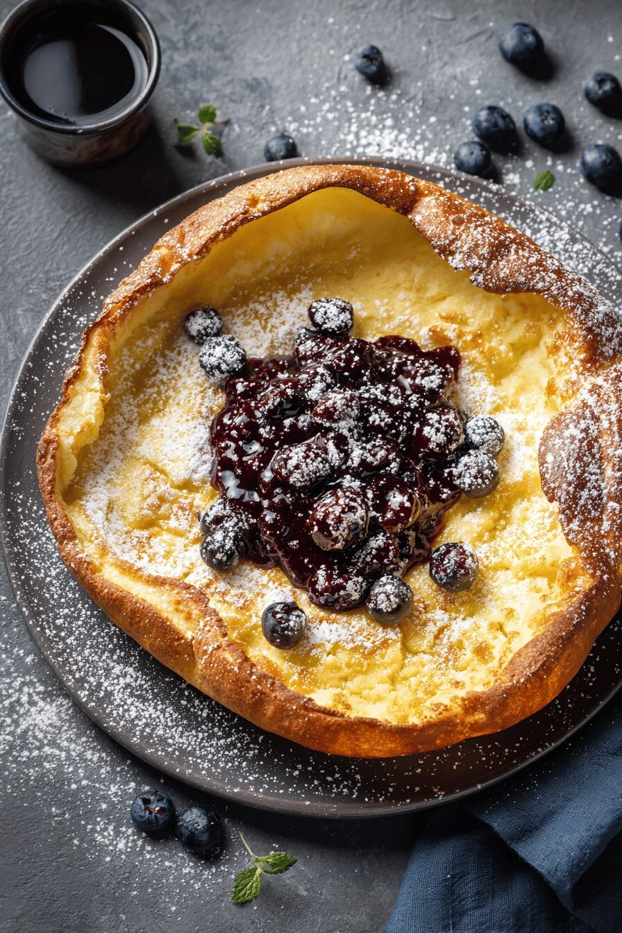 - 5 When done, remove gently. Dust with powdered sugar heavily while hot, add blueberry compote or fresh berries. Eat now or puff shrinks. Texture contrast: crispy edges, custardy center, the tart burst of blueberry dialogues with nutty almond notes.