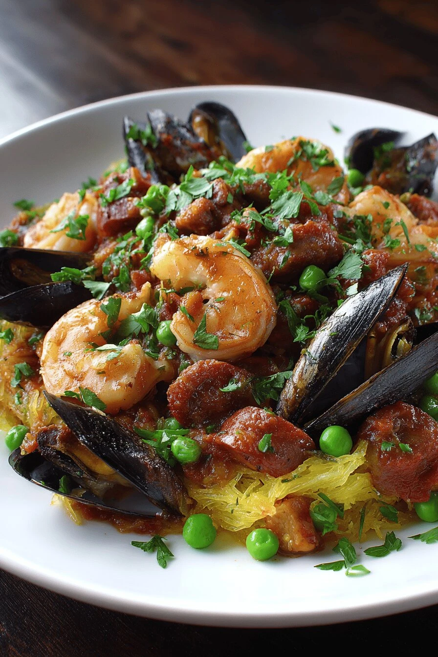 Roast the spaghetti squash first—40 to 45 minutes at 200°C. While that’s going, the seafood paella comes together in one pan. Mussels, cod, shrimp, all of it hits the skillet at the right moment so nothing overcooks. The chistorra sausage renders its fat, the spices bloom, vermouth reduces to almost nothing. Then the broth, the tomatoes, the seafood. Done in under an hour total, not counting the squash.