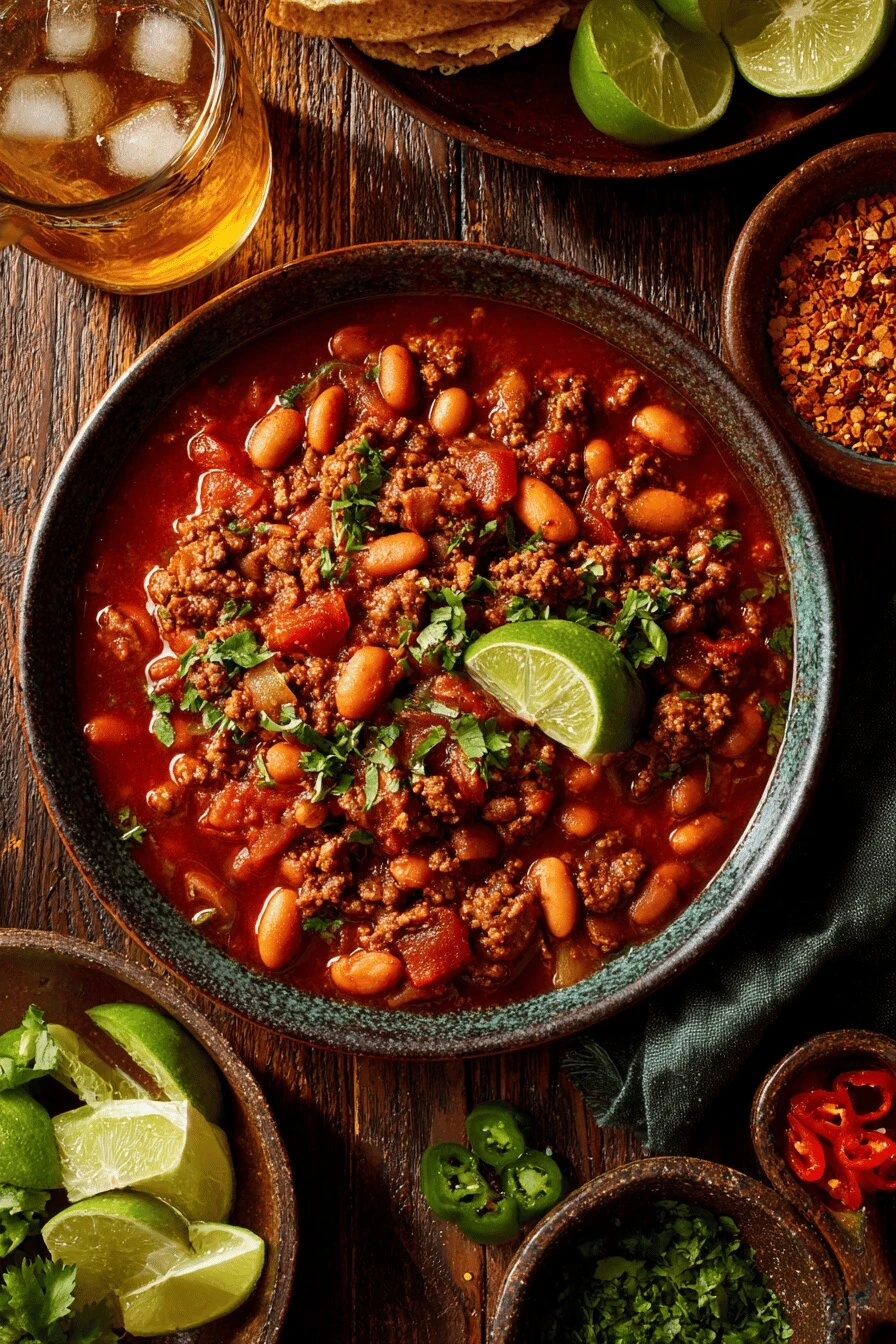 One medium onion chopped fine. Not chunks—small pieces so they disappear into the sauce. Fresh jalapeño. Keep the seeds if you want real heat. Remove them and it’s just flavor, not fire. Butter or neutral oil. Thirty milliliters. Olive oil works but burns too easy. Ground beef. 850 grams. Lean, around 15% fat. Too lean and it tastes like nothing. Too fatty and you’re eating grease. Three cloves of garlic minced small. Or four. Not a big deal either way. Chili powder. Twenty-five milliliters to start—adjust it. Some brands are hot. Some are mild. Taste as you go. Smoked paprika and cumin. A teaspoon each. They do different things. Don’t skip either. Fire-roasted diced tomatoes in a can. 796 milliliters. The roasting matters. Regular tomatoes work but they’re less interesting. Pinto beans. One can, 540 milliliters. Drain and rinse them. The starchy liquid makes it sludgy. Strong black coffee. Two hundred fifty milliliters. Brewed dark or espresso. Sounds weird. Isn’t. Deepens everything. Beef broth or water. Sixty milliliters. Just enough to loosen it up. Adobo sauce. Sixty milliliters. Smoky and sweet at once. Ketchup works if that’s what you have but adobo’s better. Fresh lime juice. Forty-five milliliters. That’s about one lime. The brightness comes in at the end. Fresh oregano or cilantro. Optional but don’t skip it. Fifteen grams chopped. Wakes the whole thing up.