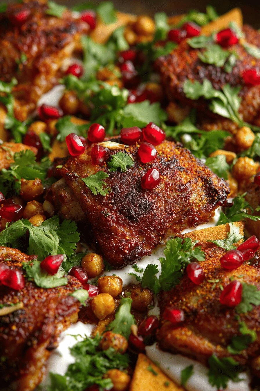- 5 To serve spread crispy pitas over large shallow platter. Heap warm chicken and chickpeas on top. Spoon half the yogurt sauce over hot filling so it pools in pita cracks. Sprinkle chili, pine nuts, cilantro leaves and pomegranate seeds for pops of sweet and herbal fragrance. Serve rest of yogurt alongside with crunchy vegetables like cucumber or radishes for bite and contrast.