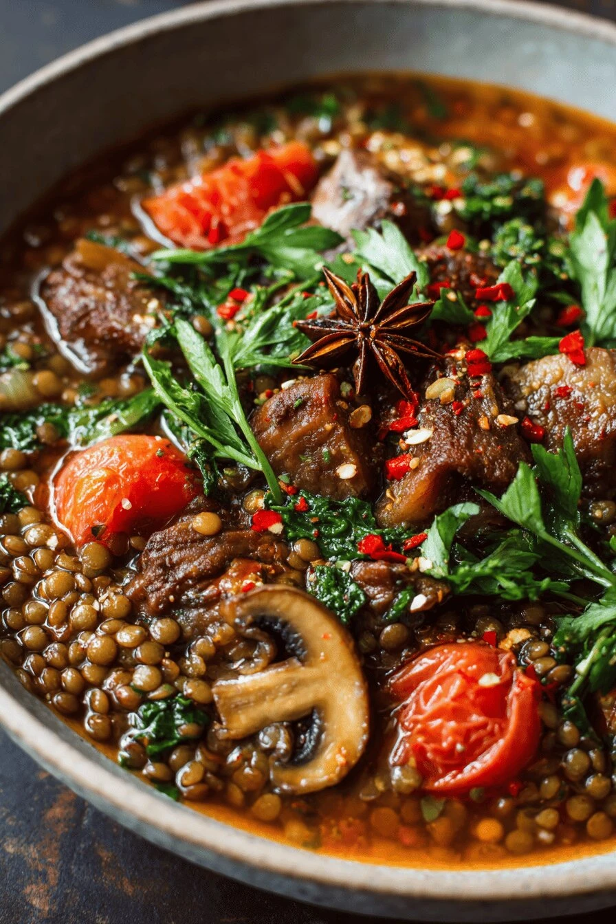 A large yellow onion, sliced. White onions are sharper. Yellow ones melt. 250 grams of cremini mushrooms, chopped. Button mushrooms work. Cremini browns better and tastes like something. Green lentils. Not red. Red ones go to mush. These hold their shape. 400 grams of cooked beef roast, diced. Leftover roast is ideal. Chuck roast, brisket—whatever you have. Already cooked matters. Two liters of beef stock. Chicken works in a pinch. Beef tastes right here. One small red bell pepper, seeded and chopped. Green if that’s what you have. Doesn’t matter as much as people say. Four garlic cloves, sliced thin. Whole cloves if you’re rushing. They’ll soften anyway. Fresh coriander, roughly chopped. Cilantro. Not parsley. Different thing entirely. Star anise. One whole one. Sounds weird. Just trust it. One and a half milliliters of crushed red chili flakes—actually closer to a quarter teaspoon. Adjust up if you like heat. Salt. Pepper. Extra virgin olive oil.