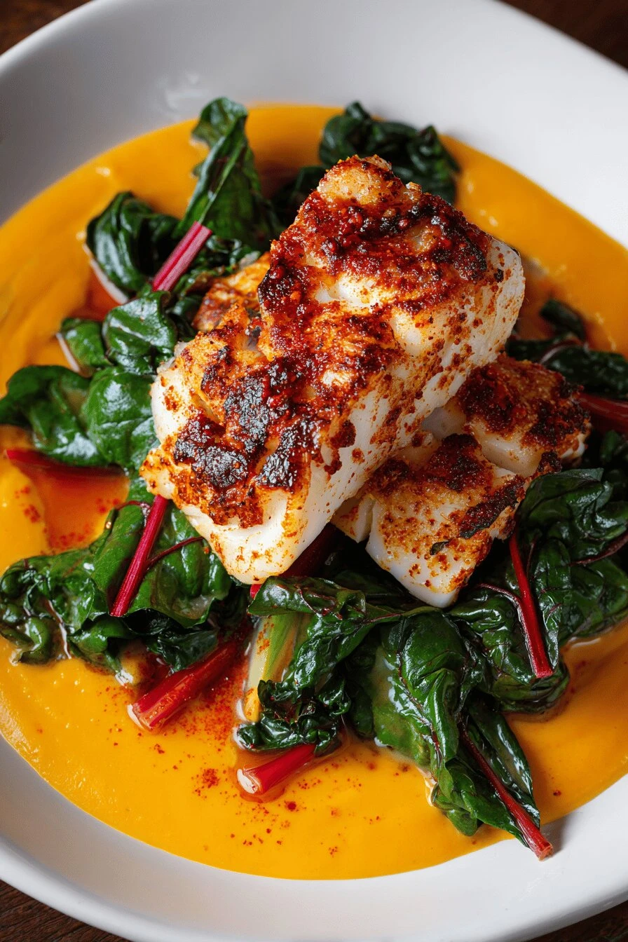 Takes 25 minutes to prep, 28 to cook. No stress. One skillet for the fish, one pot for the purée—that’s it. Healthy but tastes indulgent. The smoked paprika gets spicy without being aggressive, brown sugar balances it just enough, and the butter keeps everything rich. Works as a weeknight dinner or when you’re trying to impress someone. Swiss chard adds color. Carrot purée looks fancy but requires basically nothing—you simmer and blend. The fish stays moist. Cod’s firm enough to hold a crust but flakes tender once it’s cooked through. Not dry. Leftovers are fine cold, better reheated gently with a little butter.