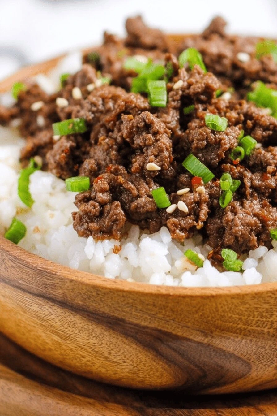 The rice matters too. Spoon the hot beef over rice while everything’s still steaming. The heat and the sauce soak in. Soft rice, caramelized beef, sesame seeds if you use them, fresh green onion on top. Contrast is the point. Eat it warm or it loses the texture.