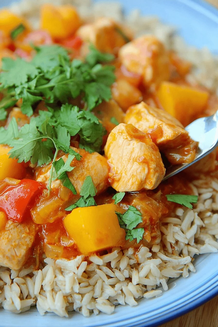 Peach slices from a can, drained—keep the juice. The actual peaches, separate from that liquid. Four boneless chicken breasts. Season them with sea salt and black pepper before anything else happens. Two tablespoons olive oil. Not the cheap stuff. The oil matters here. Red pepper strips, roasted. A cup of them. Already done, which saves you time. Half a cup of salsa. Medium or spicy. Choose your own heat level. Two tablespoons frozen orange juice concentrate. Sounds weird. Isn’t. Trust it. Red pepper flakes if you want more kick. Quarter teaspoon. Optional. Fresh cilantro, chopped. Quarter cup. The brightness at the end. White or brown rice, cooked. For underneath everything.