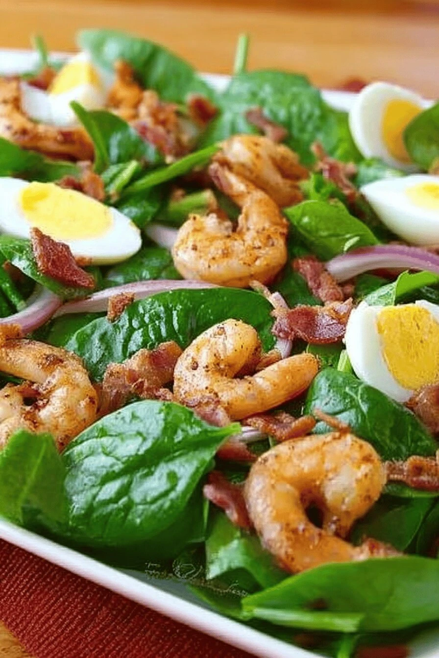 - 3 Spread spinach on a big platter or bowl so each forkful includes greens. Scatter grilled shrimp over top, add crunchy crumbled bacon, red onion rings for punch and bite. Arrange egg slices last so they don’t break into yolk mess prematurely. Drizzle warm dressing evenly but gently. Toss carefully just before serving so spinach still crisp, dressing clings, no soggy leaves. Fork-test spinach texture often. If leaves wilt early, add dressing last minute or toss in smaller batches.