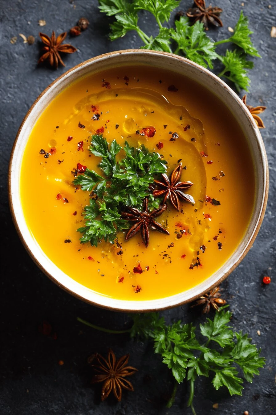 Butternut squash — three cups, cubed, peeled. Gets soft fast once it heats up. Don’t peel it raw unless you want to spend 20 minutes on just that. Fennel. One medium bulb, diced. This is the thing most people skip and shouldn’t. Makes the soup taste like it has depth. One small onion, diced. Any kind works. White, yellow, red. Five cups vegetable broth. Not water. Broth matters. Three and a half tablespoons olive oil. Nothing fancy. The good stuff goes in at the end anyway. Star anise pod. One. Or smoked paprika if you don’t have it — half a teaspoon. They do different things but both work. Pink peppercorns for the top. Crushed. Not necessary but they look nice and taste like almost-pepper. Fresh parsley. Chopped. The bright thing at the end.