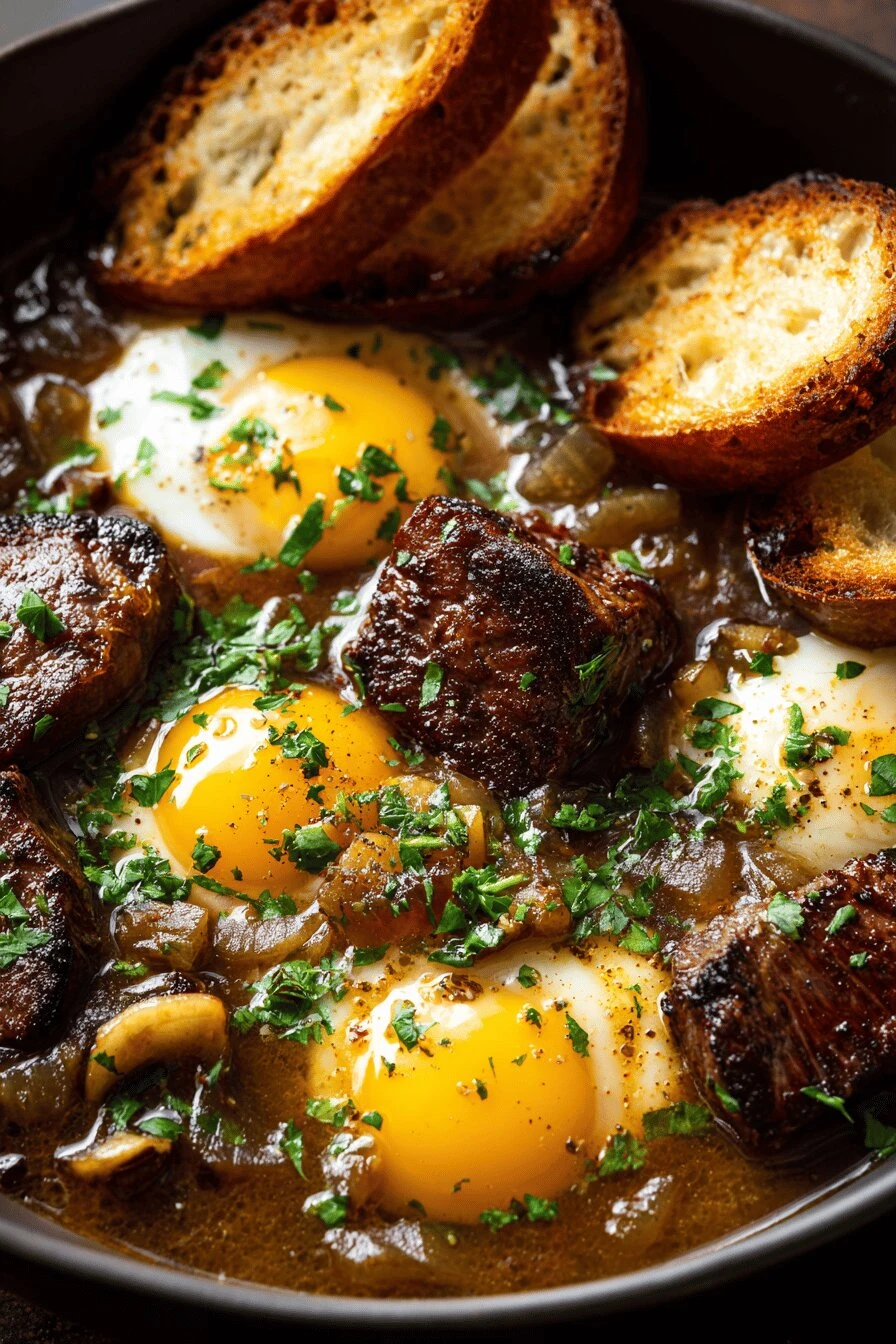 Onions go in first. Low heat. You’re not rushing this. Three pounds of them, sliced thin, melting into butter until they collapse completely — this is where the whole thing starts. Add beer, scrape everything stuck to the pot, let it boil down until the sharp bite mellows out. Beef broth next. Simmer. Meanwhile, a steak gets seared until the outside cracks and the inside stays rare, eggs cook sunny side up in the same pan, and everything comes together over toasted bread in a bowl.