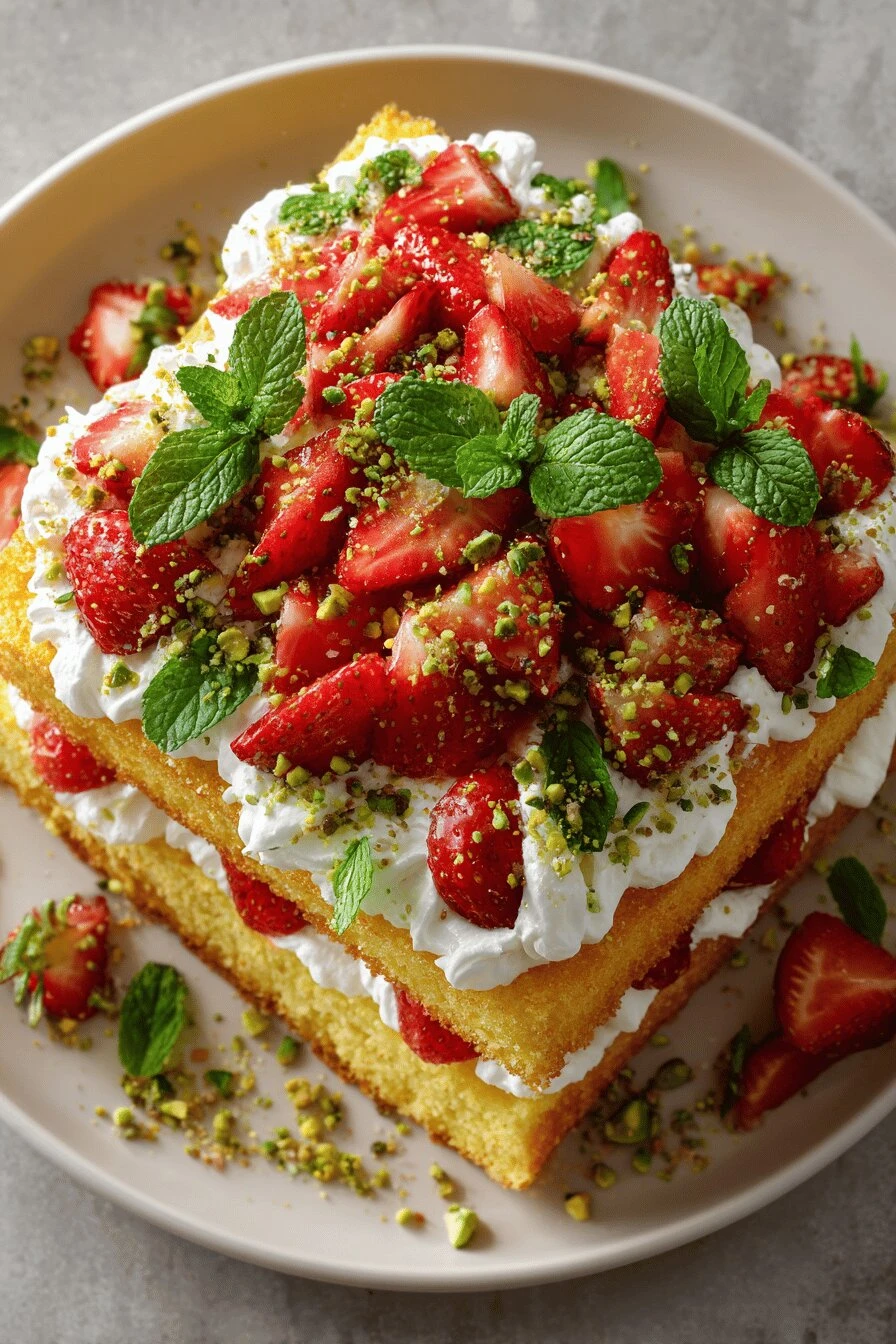 - 16 Garnish with whole strawberries, a sprinkle of crushed pistachios for texture contrast, and sprigs of fresh mint for brightness.