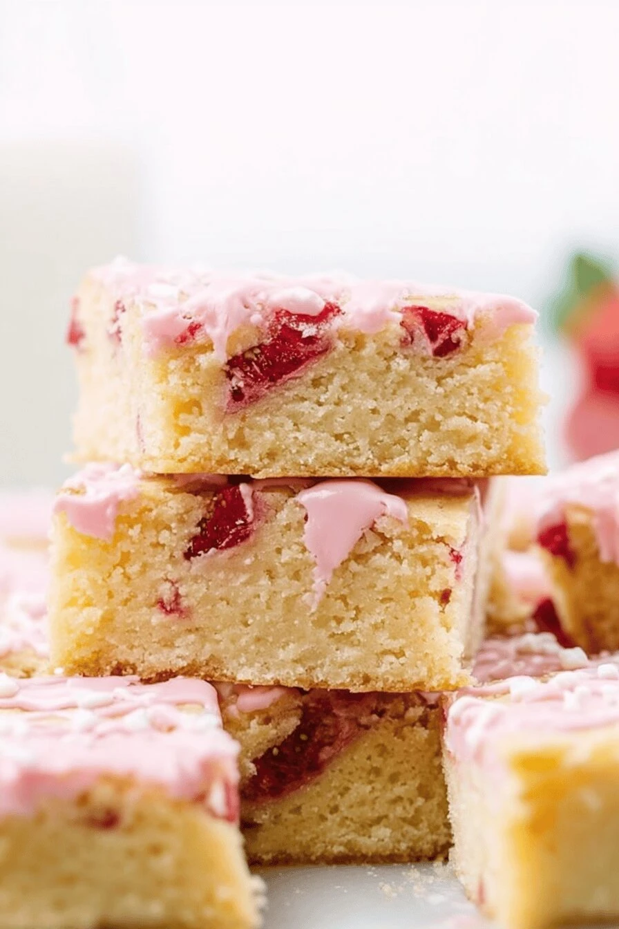 Takes 60 minutes total. 25 minutes of actual work, then you walk away while the oven does it. The crumb stays tender because of cornstarch. Nobody expects that. Works every time. Strawberries stay fresh tasting instead of turning into jam. You have to drain them — that part matters. Tastes like dessert but lighter. Not heavy. Kind of blondie, kind of cake, kind of something else entirely. Glaze soaks in while they’re warm. Adds lemon without making them wet.
