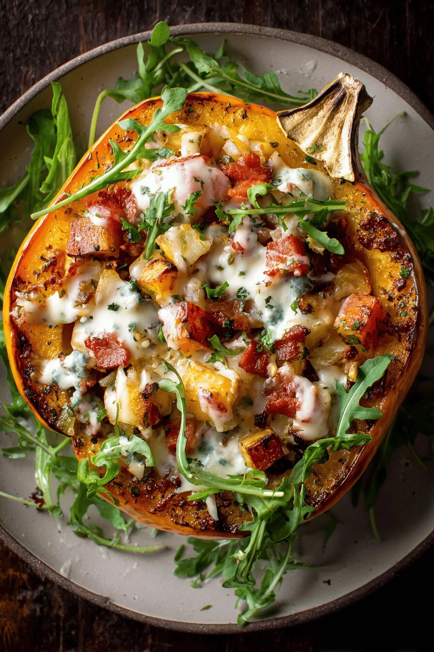 - 6 In each squash cavity, start layering: half the onion-pancetta-arugula mix, half the potato slices, then both cheeses split evenly. Dense layers trap moisture and flavor. Top with the other half of everything, finishing strong with cheeses exposed.