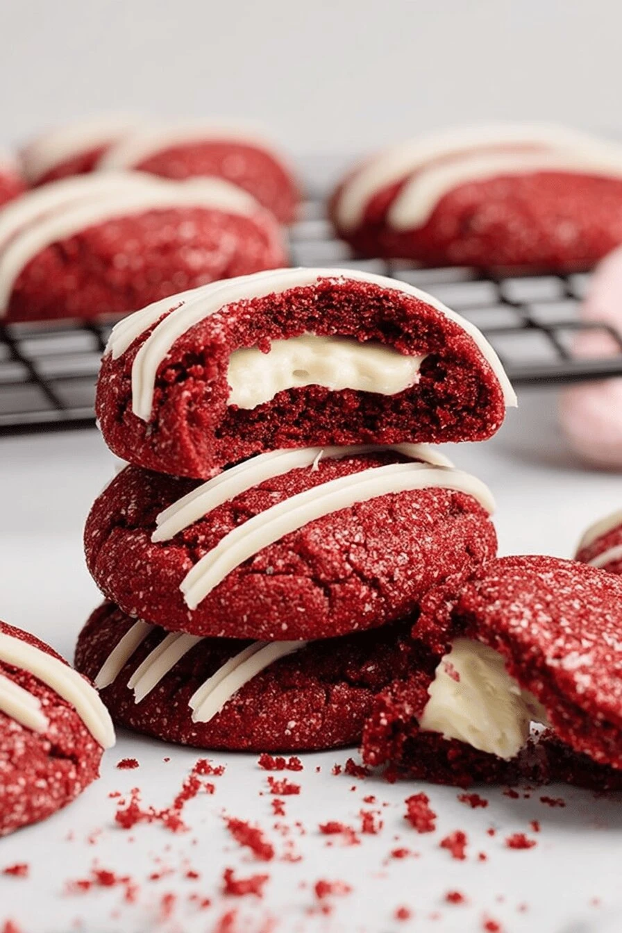 Takes 49 minutes total, but most of that’s waiting around. Actual hands-on time is maybe 20. Tastes like a fancy dessert. Tastes like you tried. You didn’t try that hard. Red velvet with cocoa underneath. White chocolate drizzle on top. Three chocolate moments happening at once. Cream cheese filling stays firm inside — doesn’t melt into the cookie. That’s the whole thing. Works as a gift. Works as dessert after something else. Works cold straight from the fridge, which is weird but good.