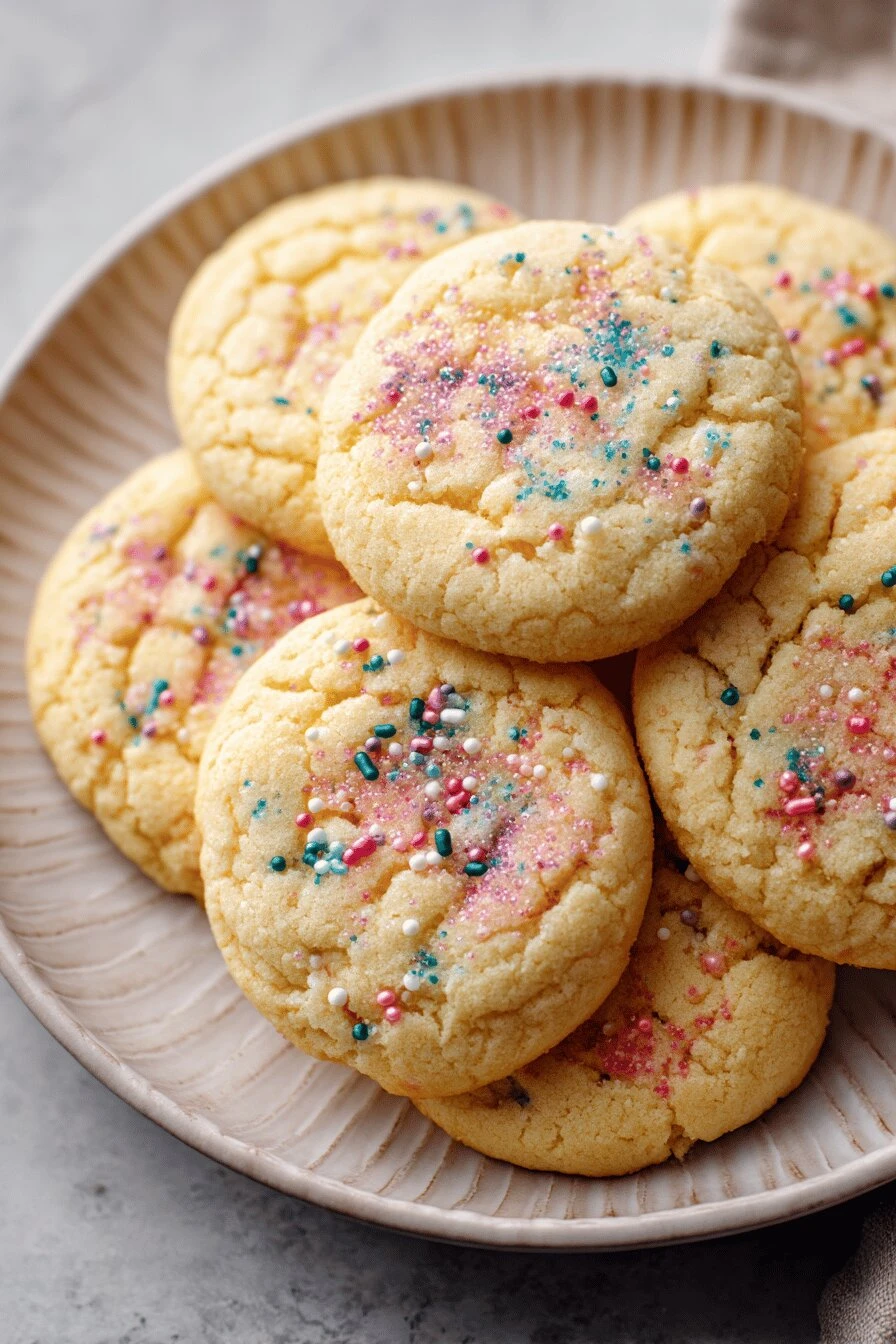 Unbleached all-purpose flour. Two and a quarter cups. Bleached works but tastes thinner. Baking powder—half a teaspoon, not a tablespoon. People mix those up constantly. Salt. A quarter teaspoon. Butter. Three quarters of a cup, softened. Room temperature. Not melted. Not cold. If it’s cold it won’t cream right. Granulated sugar. One and a quarter cups. Brown sugar makes them chewier but this is the regular recipe so granulated. Vanilla extract. A teaspoon. The real stuff, not imitation. One large egg. That’s it. Colored sugar crystals if you want them on top—optional but they catch light and look good.