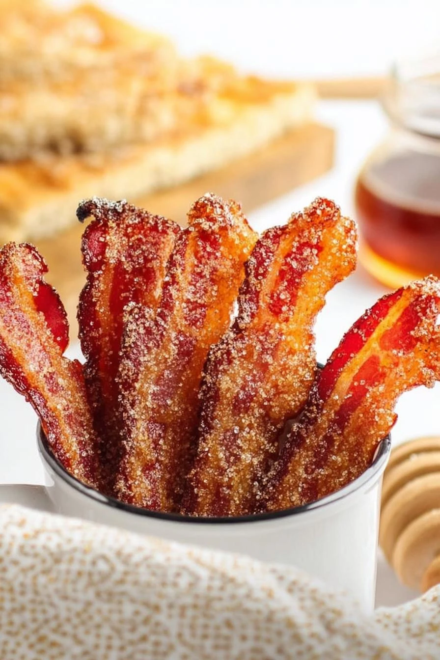Thick-cut bacon — the thin stuff falls apart before it gets crispy. Three and a half cups Demerara sugar. Not regular granulated. Demerara’s coarser, doesn’t dissolve completely, stays on the bacon as a crust. Cracked white pepper. Two tablespoons. The crack matters — powder gets lost in the glaze. Smoked paprika and cayenne pepper — a teaspoon each. The paprika adds that smoky thing without making it taste like a grill. Cayenne’s the kick. Maple syrup for drizzling at the end. Not the fake stuff. Real maple does something different when it hits the heat. Nonstick cooking spray. Parchment paper or heavy-duty foil. You need both layers — foil catches the drips, parchment keeps the sugar from sticking to the foil.