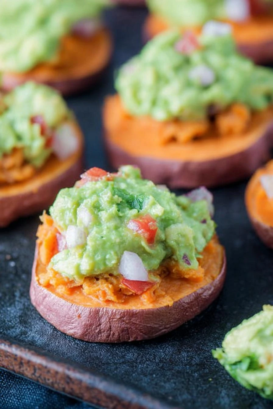 - 5 Once sweet potatoes come out, cool slightly to avoid avocado melting or sweating. Spoon generous dollops of guacamole onto each round. Scatter chopped cilantro and diced tomatoes over top for freshness and color.