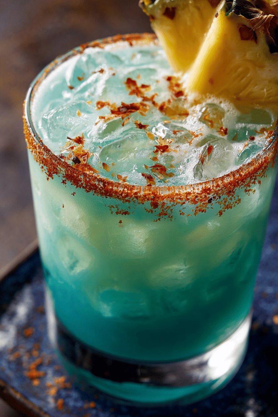Pour the rum, blue curaçao, pineapple juice, coconut cream, and lime juice into a shaker filled with ice. Shake it hard for 20 seconds. That’s basically it. The glass gets sugared first — lemon wedge on the rim, dip it in sugar, chill it while you’re prepping everything else. Six minutes total. Sounds like a beach bar, tastes like one too.