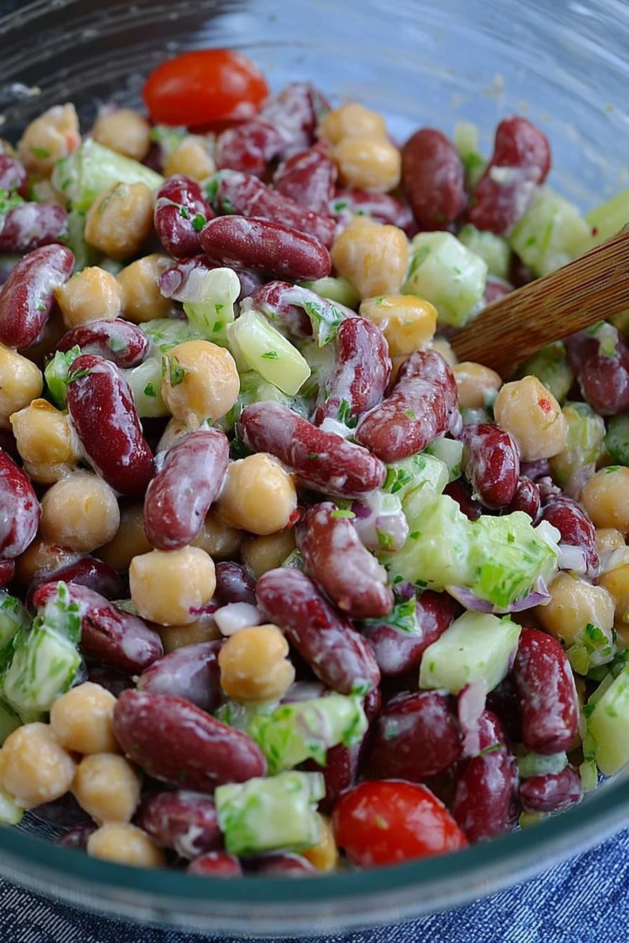 Kidney beans and chickpeas. Both canned. Rinse them, pat them completely dry — that matters. Wet beans get soggy fast and the whole salad suffers. Use a kitchen towel or a salad spinner if you have one.