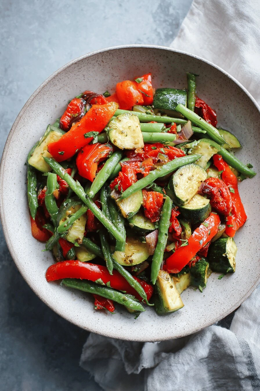 Smell it after 15 minutes. Tomato acid mixing with roasted pepper. That’s when you know it’s almost there. The green beans turn bright green first, then soft but not falling apart. The zucchini edges start to blur into the sauce.