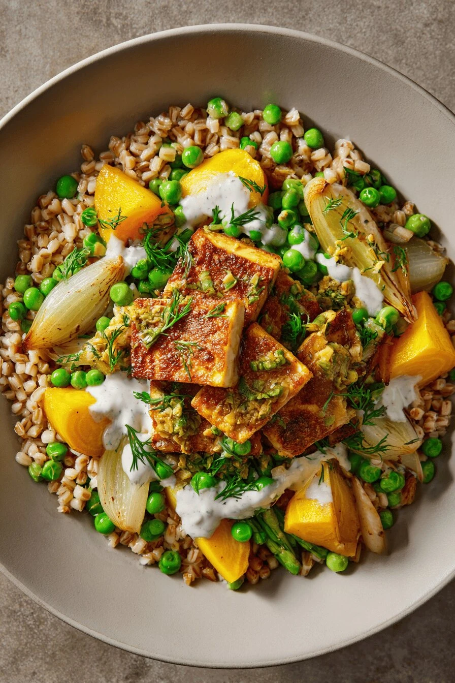- 5 In large serving bowl, fold barley and peas into roasted veggies gently, so colors stay vibrant. Sprinkle fresh mint for cooling lift. Plate portions of veggie-barley mix into bowls. Top with warm tofu slices. Drizzle dressing over or serve on side. Add crisp romaine or baby spinach if you want greens.