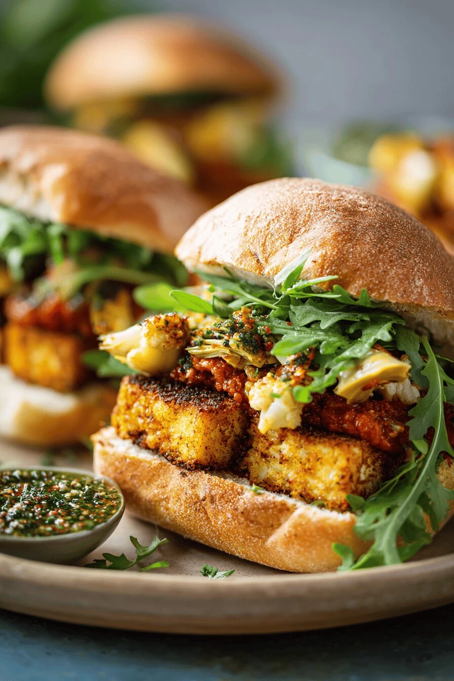 Layer fresh arugula on top of the artichokes. Add the hot cheesy tofu slabs. Close it. Press gently. Cut in half if you want.
