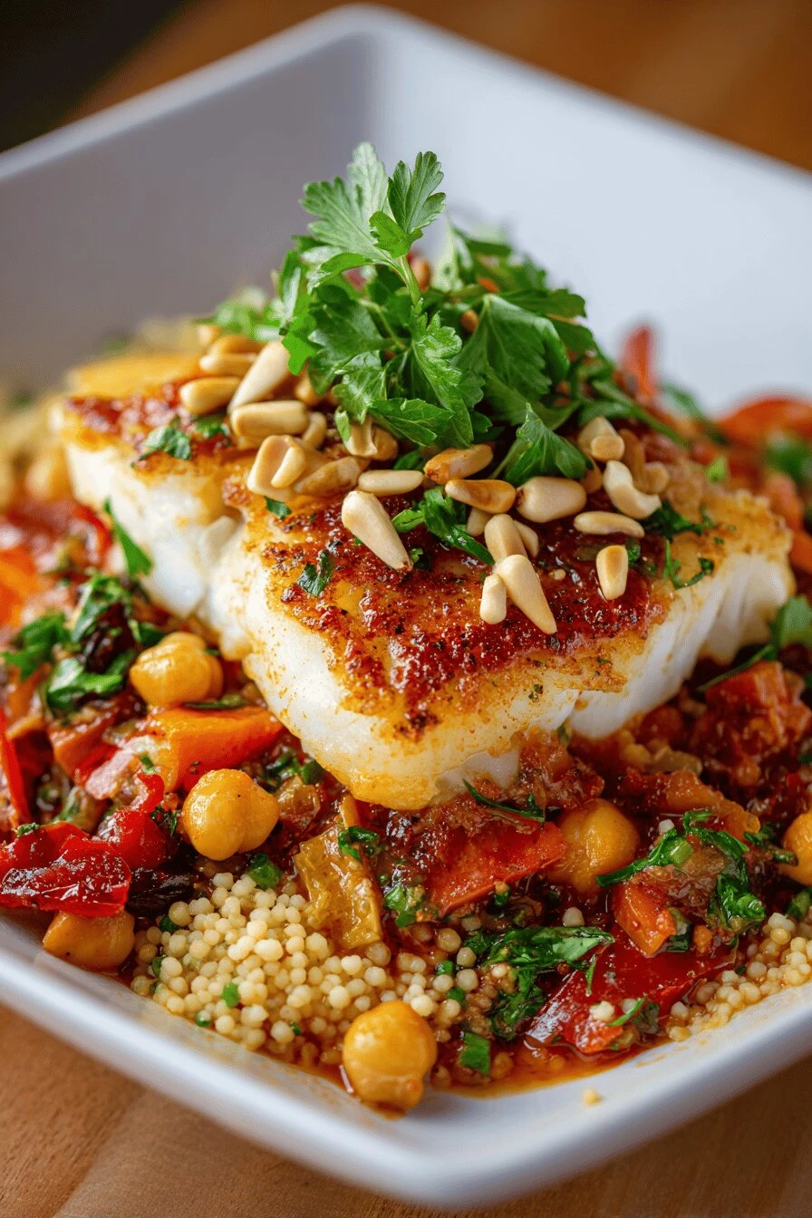 Takes 60 minutes total if you don’t overthink it. The fish stays tender because you sear it first, then it basically rests in the warm broth—no rubber, no dried out mess. Seafood and spice shouldn’t be complicated but this makes it feel that way anyway. One pot. One skillet. Everything builds in the same place. Works cold the next day, maybe better. Harissa gives you heat without tasting like it’s trying too hard. The couscous absorbs all that Moroccan spice-and-broth situation and actually tastes like something happened to it.