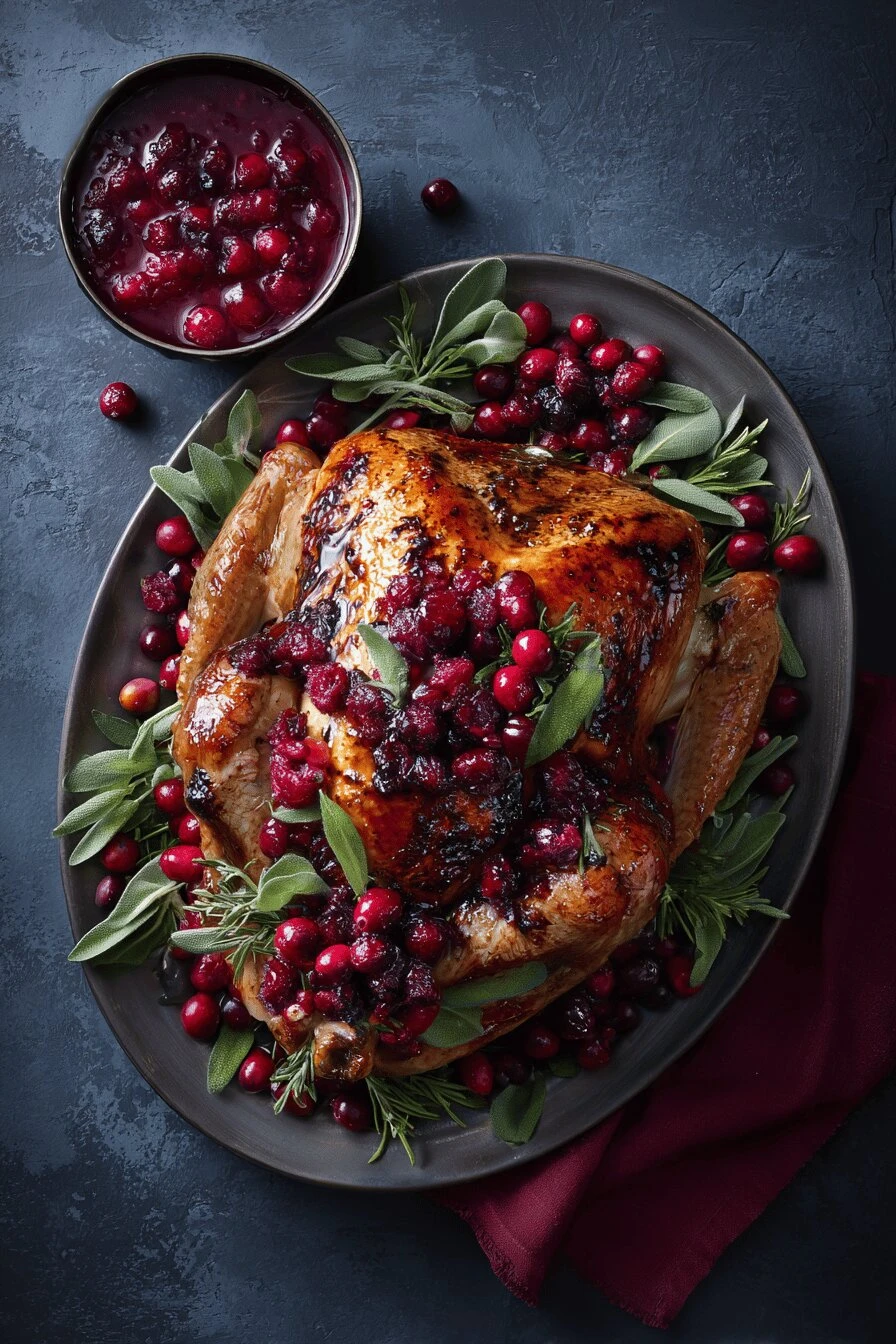 A 2.4 kg turkey roast—the breast, usually tied. Two onions, finely chopped. One garlic clove, minced. 25 ml each of unsalted butter and olive oil. 700 ml chicken stock split across the roast. Fresh cranberries—500 ml, halved. 220 ml demi-glace. Salt and pepper. Optional but worth it: pomegranate arils and fresh sage leaves for the final scatter.