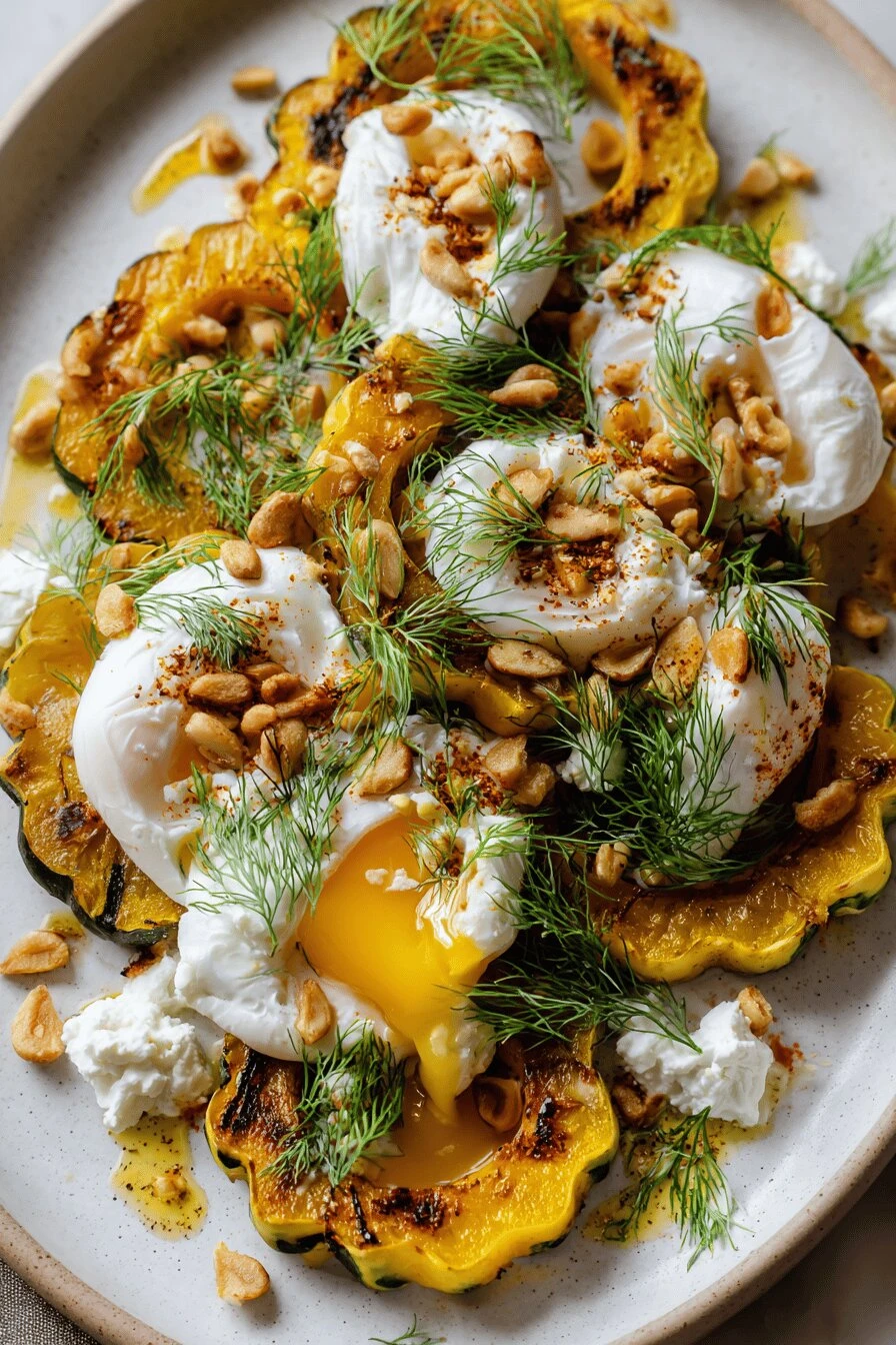 - 6 Spread labneh over serving plates as a cream base. Arrange roasted delicata slices over the labneh. Place peeled poached eggs carefully atop squash slices.