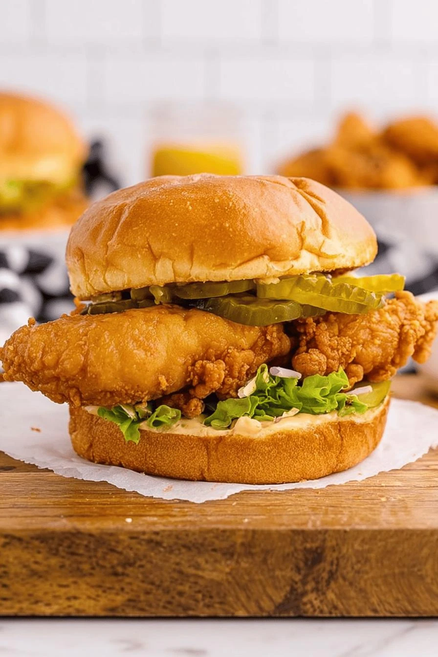 Slice the chicken breasts horizontally first — that’s the move. Pound them thin between two pieces of parchment, let them soak in buttermilk with hot sauce and pickle juice for 25 minutes, then double-dredge in seasoned flour and fry until the crust cracks when you bite it. Fifty minutes total from start to sandwich in your hand.