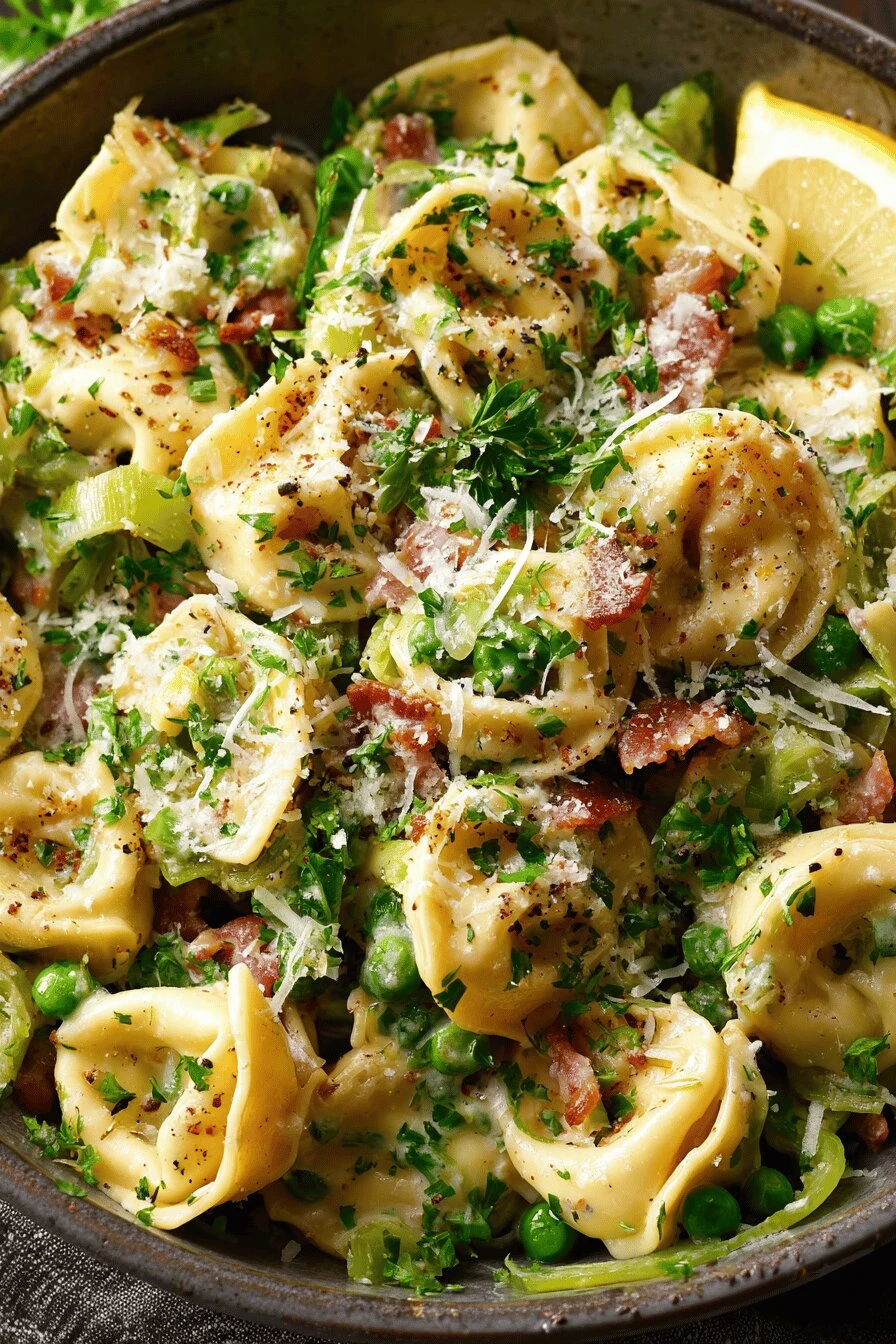 Leeks and bacon go in first—that’s the whole opening move. Brown them hard, let them go a little dark at the edges. The cheese tortellini just drops in after, straight into the stock while everything’s still sizzling. Fifteen minutes prep, eighteen minutes cooking, and you’ve got a complete dinner that tastes way more involved than it actually is.