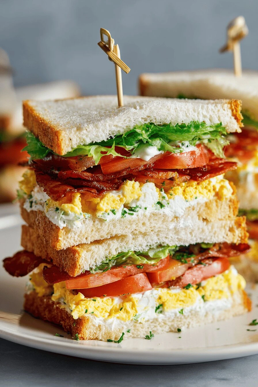 - 6 To build each sandwich: bottom slice, layer egg piece, three bacon slices. Second slice of bread goes on top. Then three tomato slices, followed by two Boston lettuce leaves. Crown with the last bread slice pressed gently into place. Insert toothpicks at four corners to stabilize the stack, then slice diagonally into neat triangles. Repeat for all sandwiches.