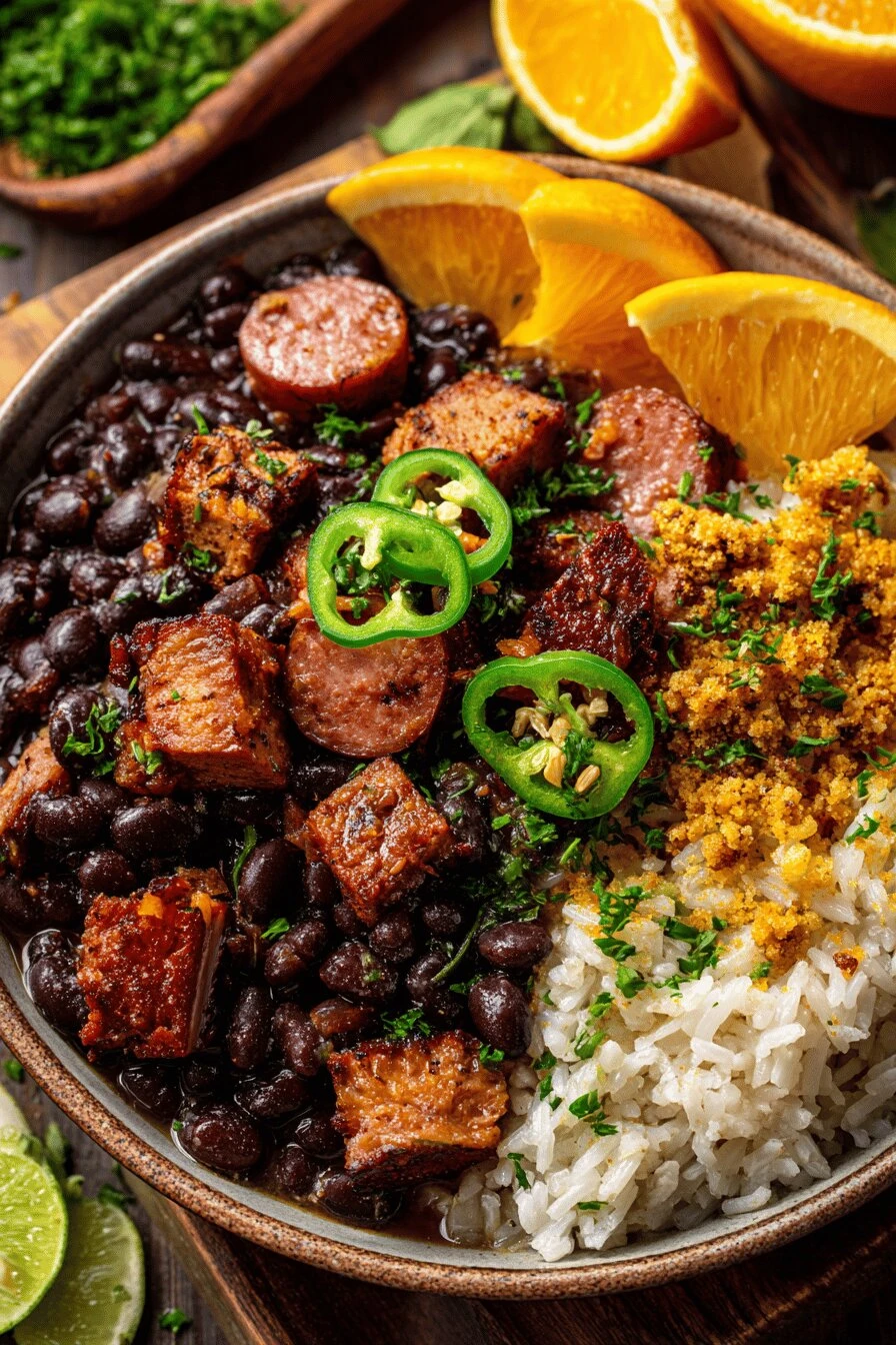 - 14 Serve hot with fluffy white rice, toasty farofa, and orange slices crisp and juicy to cut richness.