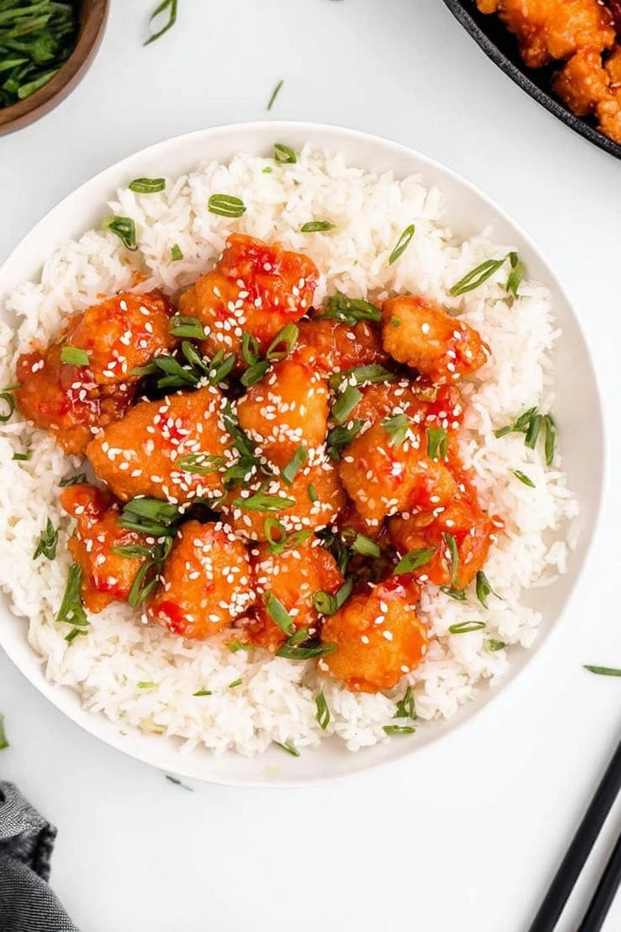 Make your sauce by whisking together chili garlic sauce, sugar, rice vinegar, salt, and red pepper flakes. Taste it. Too sweet? Add vinegar. Too sour? Add a bit more sugar. It balances itself out pretty fast. Arrange the fried chicken in a single layer on your foil-lined sheet. Pour the sauce over it evenly. Use tongs or a spoon to toss the chicken gently so the sauce coats every piece. Work fast so it doesn’t pool on the bottom. Bake 22 to 27 minutes. The sauce should bubble at the edges and start caramelizing. A sticky glossy coating forms. Too long and the chicken dries out. Too short and the sauce stays thin. Halfway through, toss the chicken again to redistribute the sauce and prevent sticking. When it’s done the sauce thickens more as it cools. Shiny. Clings to everything. Transfer it to a serving dish with any juices from the pan. Sprinkle green onions and sesame seeds on top. The green onions stay bright. The sesame adds actual crunch.