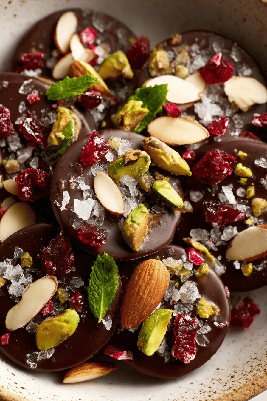 - 4 Immediately scatter almonds, pistachios, figs, dried cranberries generously over each. Sprinkle crushed peppermint sparingly—adds crunch, unexpected bite. A sneaky pinch of flaky sea salt onto each disc. Salt wakes flavors, prevents cloying.