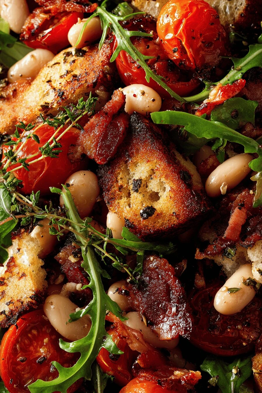 Can you make this panzanella without bacon? Yeah. Skip it. It’s still good. It’s a different salad but the bread and tomatoes and white beans are doing enough work. Try adding an extra tablespoon of olive oil to make up for the fat.