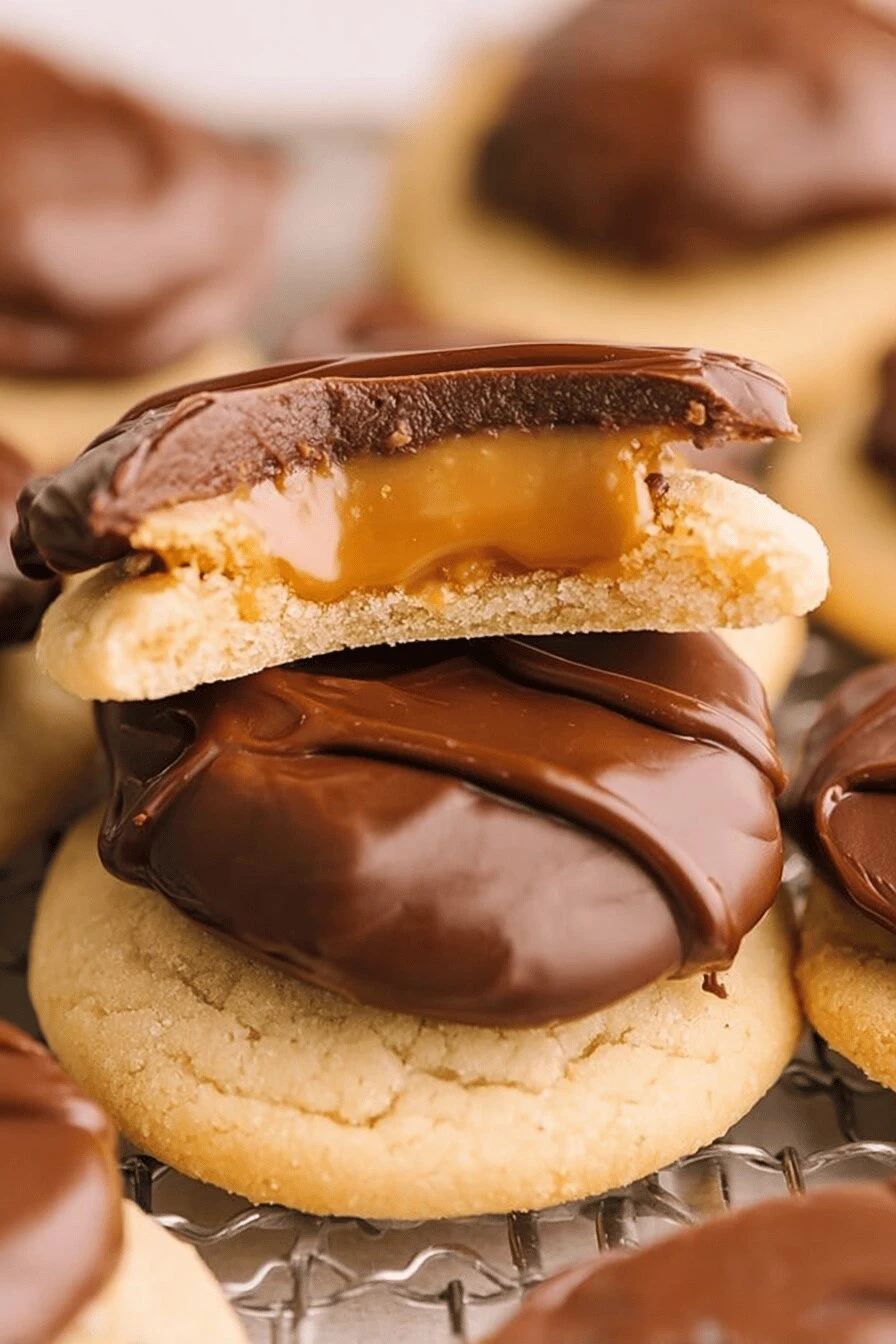Caramel and chocolate stacked on top of each other. Most cookie recipes don’t do this. Tastes like candy but it’s actually a cookie.