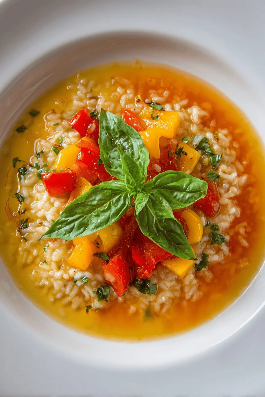 - 5 Add vinegar to deglaze pan, scraping bottom to lift flavor bits. Toss in rice, stir to coat. Add chopped peeled red peppers and broth. Simmer covered on very low heat 18-22 minutes until rice is tender. Puree and season to taste.