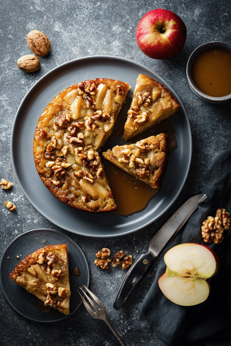 Warm cake with that sticky caramel pooling underneath when you cut into it. The apples keep it moist, walnuts add crunch that doesn’t quit. Takes an hour and twenty minutes but most of that’s hands-off baking. Almond milk works perfectly here—doesn’t make it taste like almonds, just lightens everything. Tastes better the next day, honestly. Flavors actually marry overnight.